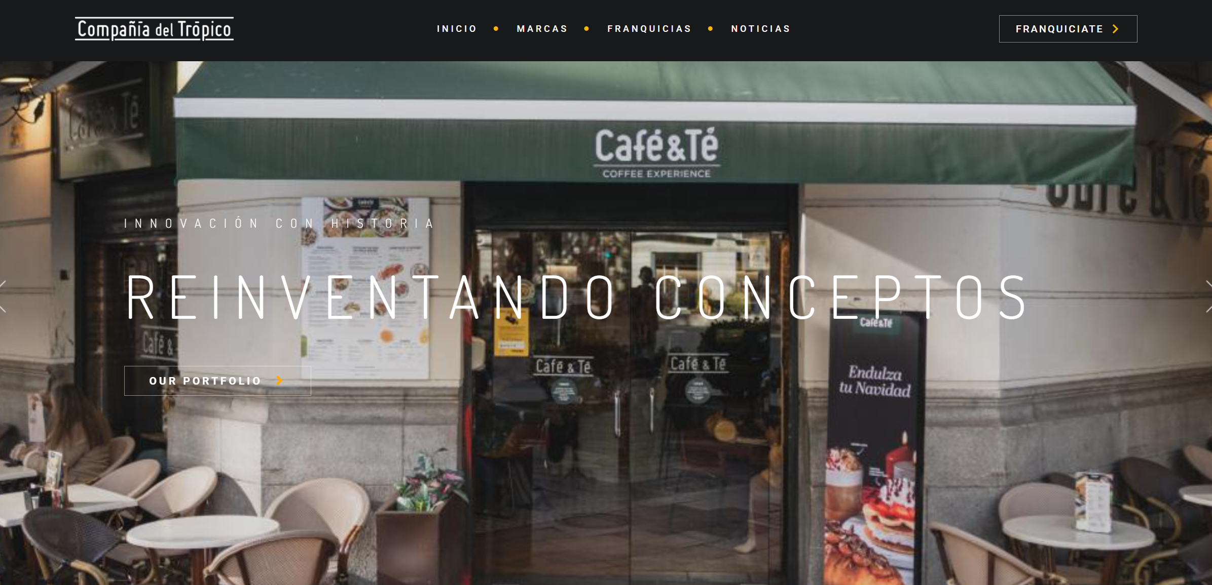 En Compañía del Trópico damos un paso más en nuestra evolución con el lanzamiento de una nueva página web, pensada para conectar de forma más directa, clara y atractiva con nuestros clientes, socios y potenciales franquiciados. Esta nueva plataforma digital refleja nuestra identidad, nuestras marcas y los valores que nos mueven, integrando todos los mundos que forman parte del grupo: cafeterías, panaderías, tabernas y experiencias gastronómicas singulares.